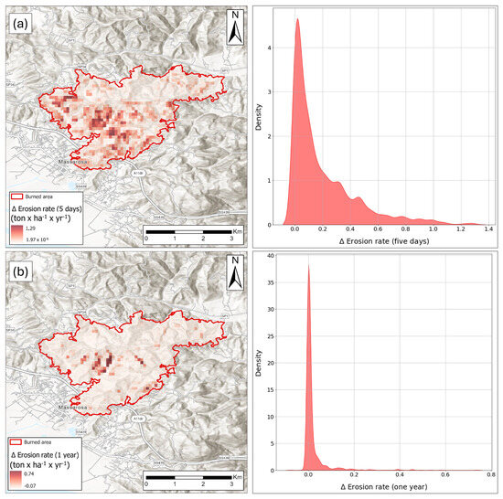 Differences in soil erosion rates. (a) Differences between the “five days after” and the pre-fire scenarios and the KDE plot of its distribution. (b) Differences between the “one year after” and the pre-fire scenarios and the KDE plot of its distribution.