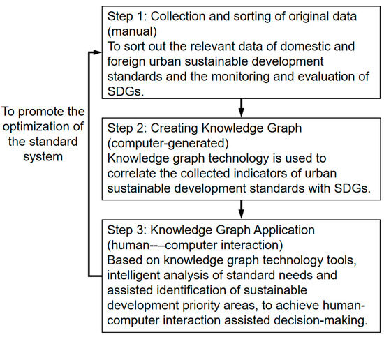 This study involved the application of knowledge graph technology to analyze the relationship between urban sustainable development standards and Sustainable Development Goals (SDGs) and designed 9 entities and 10 types of relationships. Based on 173 original SDG indicators that can be implemented at the city level, a library for cities’ sustainable development (ILCSD) was established to include 417 indicators (excluding the overlap of one-to-many indicators). From the following three aspects, we propose that the application of knowledge graph technology in the standardization of urban sustainable development has great potential.