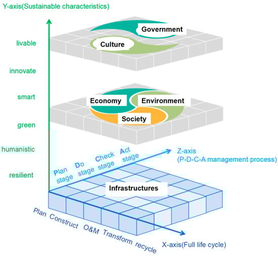 The framework model for urban standardization. The X-axis includes different stages throughout the whole life cycle (Planning, Construction, O&M, Transformation, and Recycling). The Y-axis refers to different aspects of sustainable cities, and the Z-axis indicates the different stages of the PDCA management process (Plan, Do, Check, and Act).