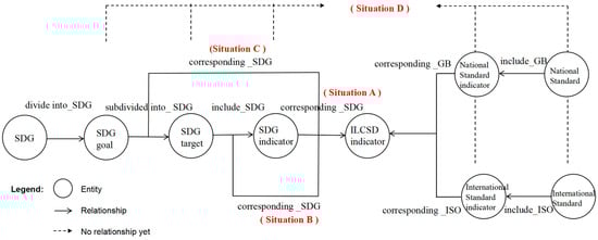 In Situation D, there are no data on the ILCSD indicator field; that is, the relevant standards of the source of ILCSD indicators do not respond to the corresponding SDG indicators, and there are still gaps in standards or indicators addressing this goal (see Table 8 for details). The entities and their relationships are shown in Table 9.