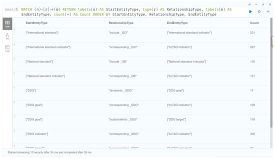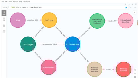 After manual sorting, an Excel table containing data from the United Nations Sustainable Development Goals (abbreviated SDGs in the table), the International Organization for Standardization (abbreviated ISO in the table), and China National Standard (abbreviated GB in the table) was obtained, as shown in Table A1 in Appendix A. After manual Excel sorting, four entities and their different relationships are summarized according to whether the database fields of “SDG goal”, “SDG target”, “SDG indicator”, and “ILCSD indicator” in each column of data are empty.