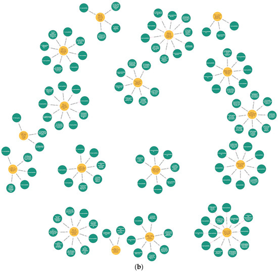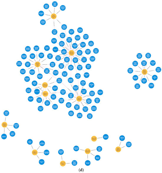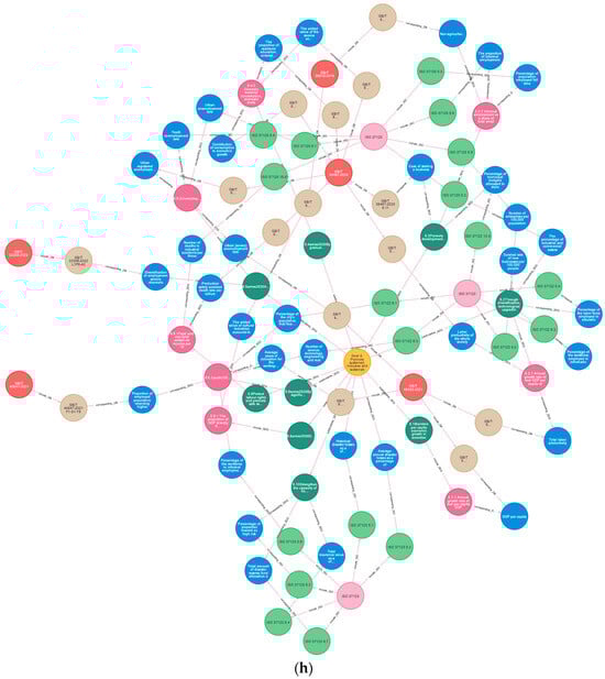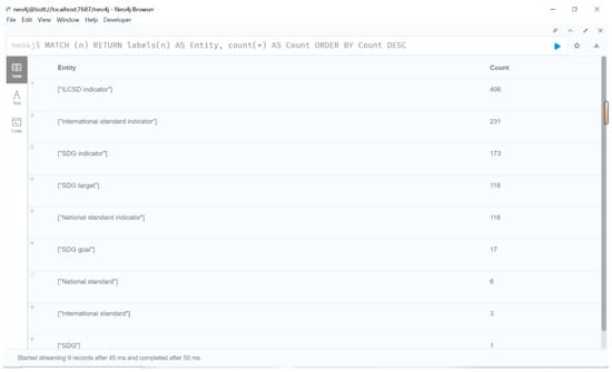 Run “MATCH (n) RETURN labels (n) AS Entity, count (*) AS Count ORDER BY Count DESC” in Neo4j to view the number of various entities in the current database, and the results are shown in Figure 6 and Figure 7a–i. Meanwhile, Table 13 shows the results returned by querying all entities of each type in Neo4j.