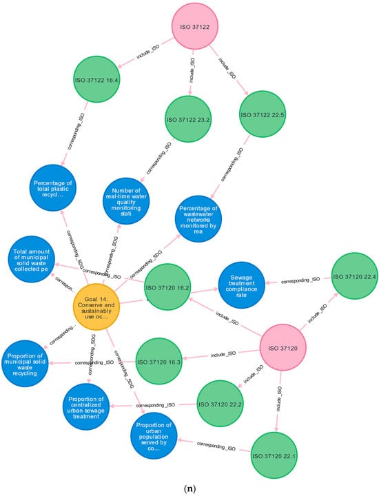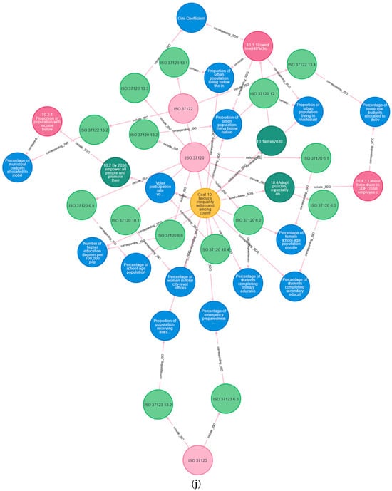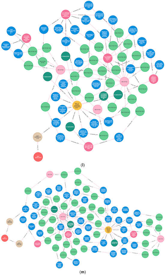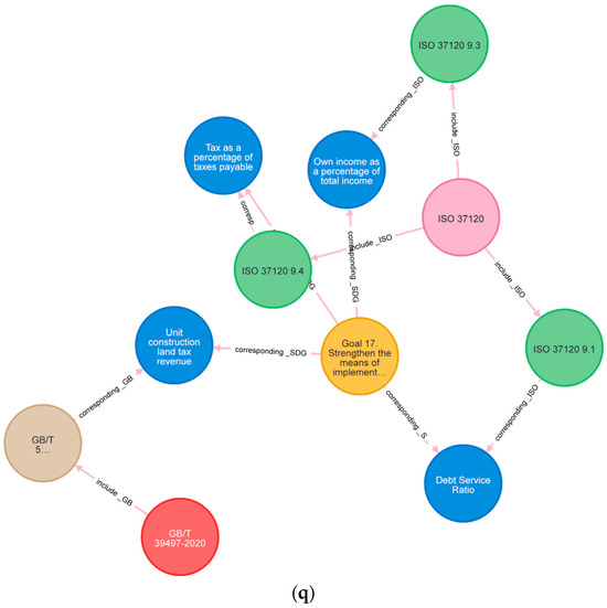 Run “MATCH p=(sdg:SDG target)-[*]->(: ILCSD indicator)<-[*]-(: National standard indicator | International standard indicator) in Neo4j WHERE sdg.name CONTAINS “Goal 1”. RETURN nodes(p), relationships(p). One can view Goal 1’s relevant response entities and relationships, as shown in Figure 10a–q below. As the need for statistics expands, “Goal 1” in the above example can be replaced with other SDG goals, targets, and indicators.