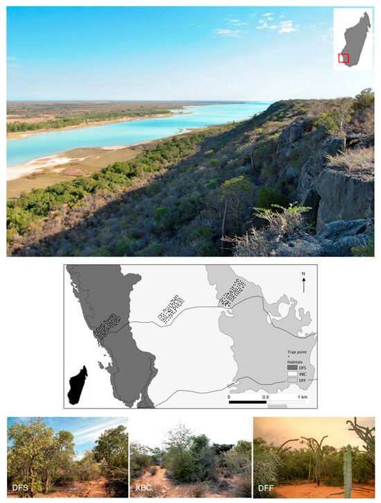 Study area and arrangement of trapping grids for the study of Microcebus griseorufus in Tsimanampetsotse National Park in dry forest on sand (DFS), xerophytic thicket (XBC), and dry forest on ferruginous soil (DFF) (photo credits: Y. R. Ratovonamana and P. Giertz).