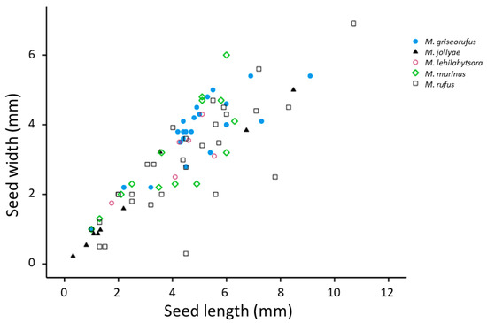 For the humid eastern forest at Ranomafana seed size has been measured for fruits dispersed by the community of frugivorous lemurs and birds [57]. We assume that this database can also be used for comparisons with the humid eastern forest of Kianjavato, some 50 km east of Ranomafana. For the humid littoral forest of Ste Luce in southeastern Madagascar fruits consumed by bats and small mammals were also studied [21,55,58]. We compared the size of seeds in fecal samples of the Microcebus spp. Occurring in these vegetation types with the size of seeds recorded for all frugivores at these sites. For the eastern humid forest, these were M. jollyae, mostly at Kianjavato, and M. rufus at Ranomafana [23,65,66,67]. For the littoral forests of southeastern Madagascar, these were M. murinus and M. tanosi [55,58,68] (Table 2). Since seed length and width were closely correlated, we restricted the following analyses to length.