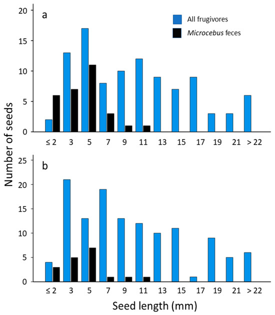 The maximum length of seeds present in Microcebus feces was 10.7 mm in the humid eastern forest of Ranomafana and Kianjavato, and 10.4 mm in the littoral forest of Mandena and Ste. Luce (Table 2). Thus, based on seed length, Microcebus spp. would have the potential to disperse seeds of more than half of all fruit species occurring in the humid and littoral forests, most seeds swallowed by Microcebus are well below the maxima (Figure 3). The differences in seed length between those passed through the digestive tract of Microcebus and the length of all seeds measured were significant for Ranomafana and Kianjavato, as well as for Mandena and Ste. Luce (Mann–Whitney-U tests: z > 3.8, p < 0.001 in both cases). It should be noted that both databases do not consider dry fruits and hard-shelled fruits that are not typically consumed by frugivores and cannot be opened by Microcebus spp.