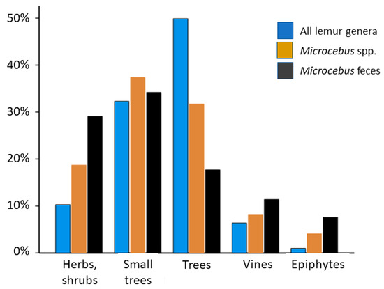 Microcebus spp. feed significantly more often on the fruits of herbs, shrubs, vines, and epiphytes than other lemur genera that rely more on fruits from larger trees (χ2 = 22.89, df = 4, p < 0.001; Figure 4; Table A1; data for other lemur genera are from the Supplementary Table in [16]; the combined tables can be obtained from JUG upon request). This difference was reinforced when comparing the feeding observations of all other lemur genera with plants whose seeds had been found in the feces of Microcebus spp. (χ2 = 60.94, df = 4, p < 0.001). The life forms of plants recorded as food sources for Microcebus spp. were skewed towards trees and small trees, while herbs, shrubs, vines, and epiphytes were underrepresented in observations compared to fecal samples (χ2 = 7.66, df = 4, not significant after Bonferroni correction). Despite the predominance of seeds from herbs, vines, and shrubs in the feces of Microcebus spp., about 20% of seeds dispersed by Microcebus spp. with certainty are from trees (Figure 4).