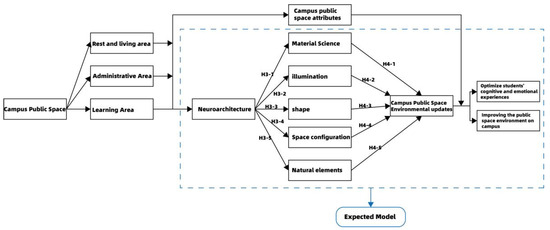Based on the above summary, we hypothesize that campus public space design that is based on neuro-architectural theory and incorporates spatial environmental attributes can significantly improve campus environments, thereby optimizing students’ physical, emotional, and cognitive experiences. In the modeling framework, campus public space is viewed as a multi-attribute public space that influences five aspects (H4-1 to H4-5) of the campus public space environment through five variables (H3-1 to H3-5) that we hypothesize can have positive effects on the student experience. Among them, H4-1 represents the combination of the theoretical neuroarchitecture model and the materials used in the spatial environment, assuming that the selection of materials (e.g., wood, stone) that stimulate a positive neural response can enhance the comfort and attractiveness of the learning space; H4-2 represents the optimal combination of natural and artificial lighting to support the human body’s circadian rhythms and psychological needs, and to simulate a dynamic light environment to improve the mental state and work efficiency of students and reduce their visual fatigue; H4-3 hypothesizes that the rational design of spatial shapes enhances visual mobility, ease of use, and spatial comfort and openness to reduce stress and anxiety and promote the freedom of movement and interaction; H4-4 focuses on spatial configurations and hypothesizes that the optimization of the furniture layout and acoustic design supports different spatial types and interaction needs while taking the ergonomics and accessibility into account to enhance comfort, concentration, and productivity; H4-5 hypothesizes that the introduction of natural elements (e.g., plants, bodies of water) can create eco-friendly and healthy environments that enhance spatial aesthetics and sustainability, promote mental health, and reduce stress, as shown in Figure 2.