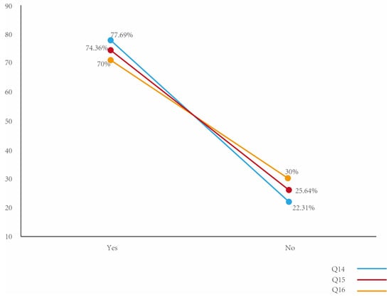 In the fourth part, the “Desire” stage, according to questions Q14–Q16 in the chart, 77.69% of the users believed that the configuration of furniture, sound, and other elements in the campus public learning space affected their personal emotions, which is much higher than the 22.31% who believed that it did not. In addition, 74.36% of users believed that the use of different building materials in campus public learning spaces affected their mood, while 25.64% believed that it did not. For light environments with different color temperatures, 70% of users said that they could feel changes in their psychological state, while 30% said that they could not. These data suggest that environmental elements have a significant impact on the emotions and psychological states of users in public learning spaces on campus (Figure 5).