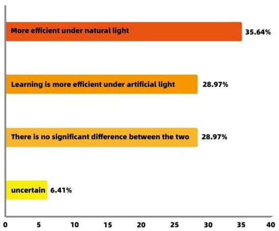 In the research, users gave feedback on the difference in their learning efficiency between natural light and artificial light environments. The results showed that 35.64% of the users believed that they learned more efficiently in natural light environments, while 28.97% believed that they learned better in artificial light environments; in addition, 28.97% of the users said that there was no significant difference between the two, while 6.41% of the users said that they were not sure. The total percentage is 99.99%, with the remaining 0.01% due to statistical error (Figure 6).