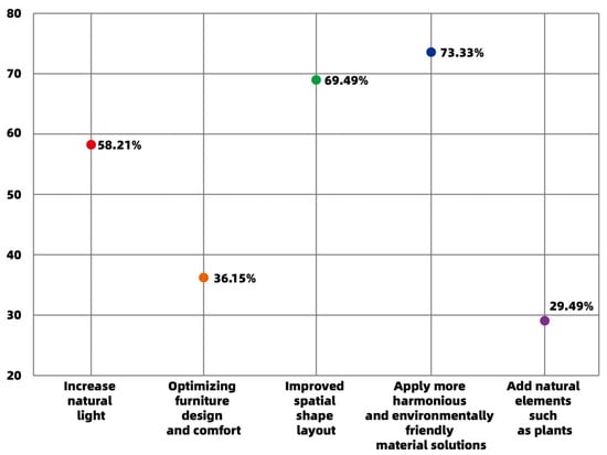 By summarizing and testing the theoretical elements related to neuroarchitecture, we examined the proportion of user preferences for the five elements of neuroarchitecture to provide a reference for subsequent space construction. The results show that 58.21% of users believed that increasing natural light can effectively reduce psychological stress, 36.15% said that optimizing the furniture design and comfort can do so, 69.49% preferred to reduce stress by improving the shape and layout of the space, 73.33% hoped for the application of more harmonious and environmentally friendly material solutions, and 29.49% believed that adding natural elements (e.g., plants) is effective at reducing psychological stress. In summary, the results of the study show that users generally want to achieve effective psychological pressure relief by optimizing the spatial layout and material choices, combined with the introduction of natural light, which are findings that provide an important basis for increasing the application of these elements in future spatial designs (Figure 8).