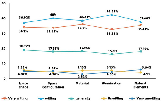 By using the action phase of the AIDA model, the preferences of users for different design elements can be effectively observed, and they can be encouraged to move from interest to actual participation in the space design and feedback process. As can be seen from the chart, the users showed a high overall willingness to participate in the design and feedback process pertaining to public learning spaces on campus. A large proportion of users were willing and very willing to participate, reflecting their positive attitude towards improving the learning environment. The proportion of users willing to participate in the design was more than one-third for all the surveyed design elements, showing that most users are enthusiastic about participating in the construction of and improvement in public learning spaces. Overall, users’ willingness to actively participate indicates that they want to have a practical impact on the spatial design through their feedback and opinions to optimize their learning experience and improve their emotional and psychological state.