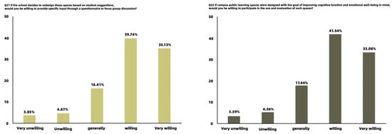 The purpose of the figure is to explore the willingness of students to engage with the design of campus spaces, particularly design solutions based on neurostructural principles. A questionnaire was designed to gather student feedback on the redesign of campus spaces and to assess their willingness to use and evaluate specific design improvements. In Q21 of the questionnaire, the results showed that 35.13% of the students were “very willing”, 39.74% were “willing”, 16.41% were “general”, and 4.87% had “unwilling” attitudes. The results show that the majority of the students were “very willing”, 39.74% were “willing”, 16.41% were “general”, and 4.87% and 3.85% were “unwilling” or “very unwilling”, respectively. This result shows that the majority of students had positive attitudes towards participating in the redesign of the campus space, and, overall, 74.87% of students were willing or very willing to provide input in various forms. Q22 investigated students’ willingness to use and evaluate public learning space design based on neurostructural principles, and particularly whether these spaces can improve their cognitive functions and emotional states. The results of the survey showed that 33.08% of the students were “very willing”, 41.54% were “willing”, 17.44% were “general”, and 4.36% and 3.59% of the students were “reluctant” or “very reluctant”, respectively. In summary, 74.62% of students were willing or very willing to participate in the use and assessment of such spaces. This result shows that students have positive attitudes towards optimizing the design of learning spaces to improve their cognitive and emotional states, and that they are willing to participate in related space use and assessment activities. Overall, the findings indicate that students have a strong willingness to participate in the design of campus spaces based on neurostructural principles. Whether regarding feedback on design solutions or participation in improving space use, students’ positive attitudes provide valuable references for future campus space optimization. Considering students’ opinions and needs when designing campus spaces will help to improve the design effect and space use experience. As shown in Figure 10.