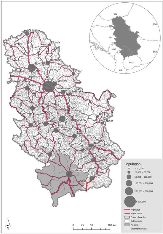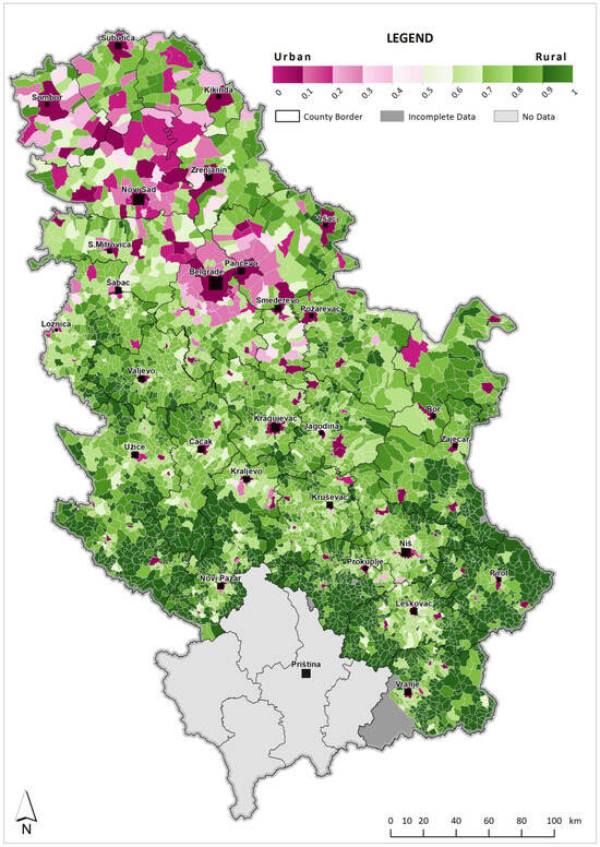 Serbia is characterized by small settlements, an asymmetric urban system, and an uneven spatial distribution of the population [60]. Our study area covered 4604 settlements. The use of settlements as a spatial unit facilitates analysis and the decision-making process in urban and spatial planning. The settlements vary considerably in demographics, socio-economic characteristics, land cover, and accessibility. As much as 80.8% of the total number of settlements have fewer than a thousand inhabitants, with 16.2% of the total population residing in these small settlements. On the other hand, only the city of Belgrade exhibits a similar population size [19]. The Republic of Serbia lacks an official definition of rural areas, complicating the research of rural and urban areas and the understanding of their interdependence, particularly evident in peri-urban zones of major cities [61]. In urban settlements, the population size ranges from 106 in Kuršumlijska Banja to 1.2 million in Belgrade. In the network of urban settlements, 16 settlements have fewer than 2000 inhabitants, while other settlements with over 10,000 inhabitants exist in the vicinity of Belgrade and Novi Sad. Settlements that are not legally designated as urban are considered rural (Figure 1) without a deeper understanding of the settlements and their functions and structure.