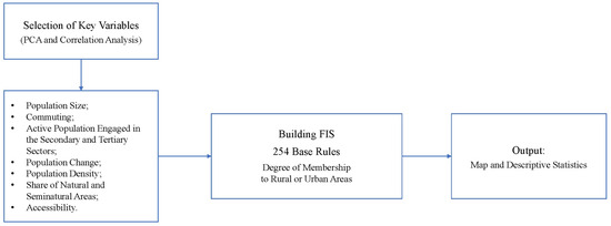 In spatial research, the application of fuzzy logic provides the opportunity to classify an area/settlement or region not strictly as urban or rural but to determine the degree of membership in both categories. Models based on fuzzy logic are referred to as fuzzy inference systems (FIS) [49]. FIS are rule-based systems that allow for the construction of structures used to generate responses (outputs, classifications) to specific stimulations (inputs or variables) based on stored knowledge on how the responses and stimulations are related [50].