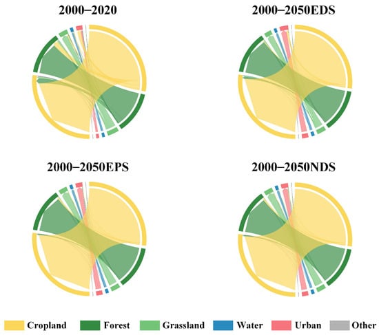 - The objective of the EPS is to protect areas with high ecological quality. In this scenario, the conversion of forest land, grassland, and water bodies into arable, construction, and unused lands is restricted to ensure ecological land development.