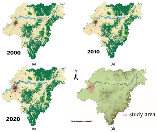 Figure 1. Delineation of the spatial scope of the study area: (a) land cover in Harbin in 2000; (b) land cover in Harbin in 2010; (c) land cover in Harbin in 2020; (d) result of spatial scope delineation. (Sources: base map is quoted from Geospatial Data Cloud https://www.gscloud.cn/ accessed on 5 August 2024).