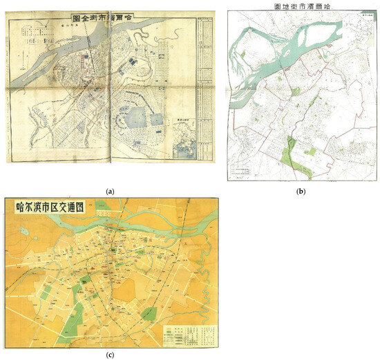 Figure 2. Historical Maps of Harbin Materials: (a) complete street map of Harbin in 1932; (b) street map of Harbin in 1946; (c) transportation map of Harbin urban area in 1977. (Sources: Official Website of the People’s Government of Harbin at http://www.hrbdw.gov.cn/, accessed on 7 August 2024).