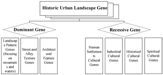 As an important component of cultural heritage, urban landscape character carries all the genetic information of urban construction carried out by urban residents of various generations in order to adapt to environmental changes. It serves as a “genetic information bank” for regional culture and traditional architectural practices [25,26]. How to inherit and control the “genes” of urban landscape character is urgent and demanding, with important practical significance. The concept of “genes” originates from biology, where they serve as the carriers of genetic information and the basic units controlling the similarities or differences in biological traits [27]. The reason why the traits of each species are so different is due to the adaptive evolution of genes in specific environments, which carry all the genetic information for biological evolution [28]. Similarly, urban landscape character is a product that evolved under specific environmental conditions, and during the evolution of urban landscape character, there also exists a basic unit controlling its features—the genes of the historic urban landscape, which carry all the genetic information related to the evolution of urban landscape character.