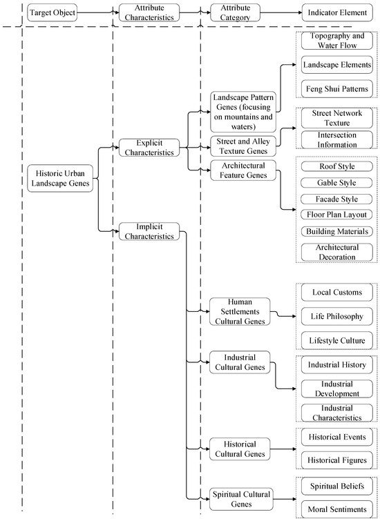 Based on the holistic perspective in system science theory, it is understood that a system is an organic whole with specific functions formed by a number of interacting elements combined according to a specific hierarchical structure [48]. The historic urban landscape genes are a system formed historically by the “genes” controlling the explicit appearance and implicit characteristics of the urban landscape, combined according to a specific hierarchical structure (Figure 3). Therefore, an indicator system for interpreting historic urban landscape genes needs to be established from both explicit and implicit dimensions. Drawing on the landscape feature deconstruction and extraction method and gene analysis method, the indicator system for interpreting historic urban landscape genes is constructed from four aspects: target object, attribute characteristics, attribute categories, and indicator elements (Figure 4), to identify historic urban landscape genes and understand the overall composition of historic urban landscape genes.