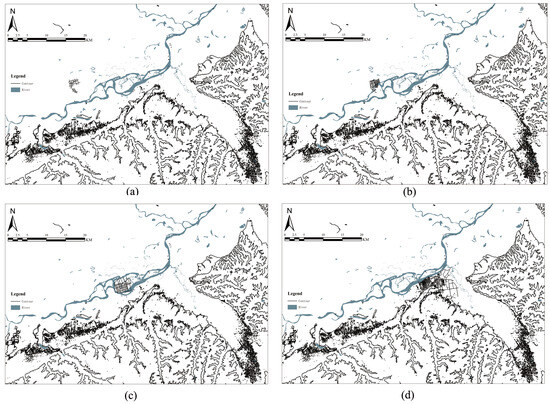 Figure 5. Harbin landscape pattern genes (from left to right): (a) landscape pattern gene in 1932; (b) landscape pattern gene in 1946; (c) landscape pattern gene in 1977; (d) current landscape pattern gene. (Sources: self-drawn by the author).