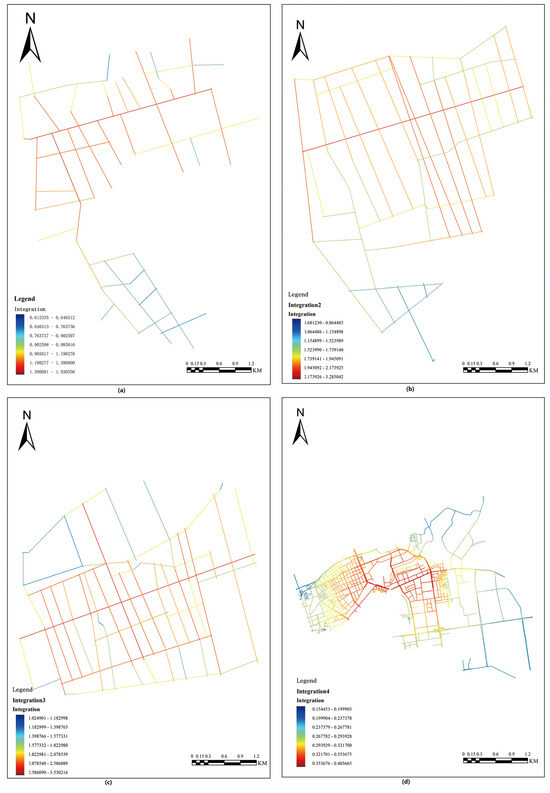 Figure 6. Harbin Street and lane texture genes (from left to right): (a) street and lane texture gene in 1932; (b) street and lane texture gene in 1946; (c) street and lane texture gene in 1977; (d) current street and lane texture gene). (Sources: self-drawn by the author).