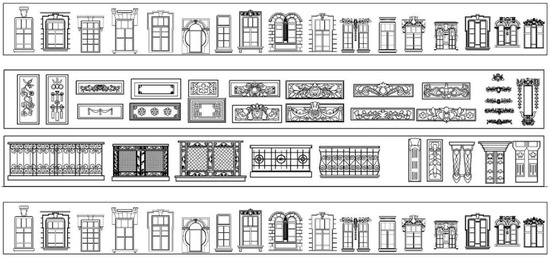 Figure 7. Part of Harbin architectural style genes (from top to bottom): roof styles and architectural decorations. (Sources: redraw based on the “Collection of Conservation Planning Results for Harbin, a Famous Historic and Cultural City”).