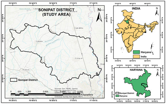 The study area, the Sonipat district, extends into the NCR (Figure 1). The Sonipat district covers an area of 2213 km2 and borders the states of Delhi and Uttar Pradesh. The district is part of the Indo-Gangetic Plains, formed during the Pleistocene epoch of the Quaternary period. The elevation across Sonipat varies, with an average altitude of approximately 224 m. Sonipat’s unique blend of rapid urbanization, agricultural dependency, and diverse landscape typologies within the NCR exemplifies challenges faced by many developing regions globally. Studying these dynamics allows for the generalization of findings to similarly urbanizing and agrarian areas, thereby informing sustainable land management practices across diverse contexts. In Haryana, the Yamuna River and irrigation canals flowing from it make up the district’s main water supply system. The district does not have perennial rivers, and different areas have different underground water resources. The Khader area along the Yamuna has the lowest water table depth, at 10 feet. Some western and southeastern parts of the district have depths of 30 to 40 feet. Certain areas have brackish and saline groundwater. In some places, the area is not level, but overall, it is a continuous part of the Haryana–Punjab plain. The soil is fine loam with rich color throughout the district. However, some areas have sandy soil, while others have Kallar. The plain slopes gently to the south and east. The district can be divided into three distinct regions: khadar, upland plain, and sandy region. The district’s climate is dry in summer and cold in winter, and the monsoon comes in July and remains until September. December marks the beginning of the winter season. The month with the lowest temperatures is January, while the months with the highest temperatures are May and June. In December, January, and February, there is light rainfall.