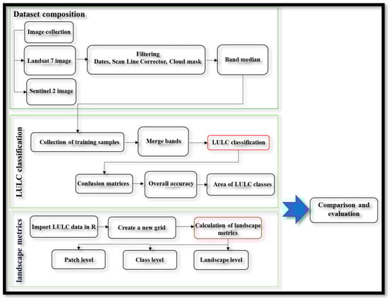 The landscape metrics evaluation was undertaken based on the prepared LULC map. A vital stage in every LULC classification is the preparation of the basis dataset. The creation of this dataset for the Landsat 7 and Sentinel-2 (Figure 2) data in this application begins in GEE with a filtered, cloud-masked image collection, and the median bands were computed. The LULC classification is based on a supervised technique, which, as is customary, requires gathering the essential information from the training points in order to train the classifiers. The random forest (RF) classifier was trained and subsequently applied to the filtered, cloud-masked image collections from Landsat 7 and Sentinel-2, with median composite bands computed to optimize classification accuracy. Further, after collecting the samples and merging the class names, code running was performed, and finally, a classified map of the study area was generated, and this classified image was used for the accuracy assessments. For validation and to determine the accuracy of the classified map, training samples were taken again. For the purpose of LULC classification, four key LULC classes were identified: cropland, waterbodies, built-up, and other. Major crop-sown areas and cultivable lands were included in the layout of cropland. Natural waterbodies, small to large reservoirs, and canals were among the waterbodies. Others were fallow and barren ground, bare soil with very little flora, and drylands. Settlements, roads, railways, and industrial sites were mostly included in the built-up area. The final map layout, including legends and spatial details, was created using ArcMap 10.8 to enhance the presentation of the classified outputs.