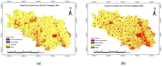 LULC map of Sonipat district, (a) 2011, (b) 2021.