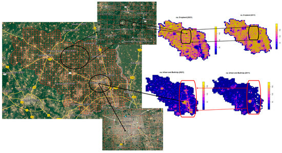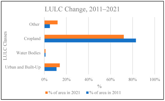 The study area comes under the NCR, and year by year, the influence of India’s capital, i.e., Delhi, can be seen in this region. Due to several developmental activities like industrialization, construction work, and an increase in residential areas, urban and built-up areas increased in the study area from 2011 to 2021, especially the parallel development along the NH-44, where urban patches increased. The urban and built-up area in 2011 was 11%, which increased to 14% in 2021, i.e., 3%. A new expressway has been constructed to improve transportation and connectivity with the capital and to reduce traffic in the capital by diverting traffic flow to the outskirts of the capital. Fallow land and barren land classes are included in other LULC classes. Other LULC classes increased from 5% to 12% during 2011–2021. The cropland started to convert into barren land due to different activities like the development of brick factories, construction work, etc. Waterbodies remained at 1% of the study area during 2011–2021, which covered the least area among other classes. These changes are clearly visible in Figure 4.