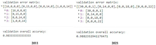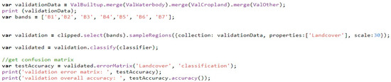 In this study, a confusion matrix is used to evaluate the accuracy of a classifier. The sample code in Figure 5 is used to validate data from a Landsat 7 and Sentinel-2 reference image. The results of the validation error matrix and overall validation accuracy are shown in Figure 6. The overall accuracy of the classified maps was 0.98 in both years.