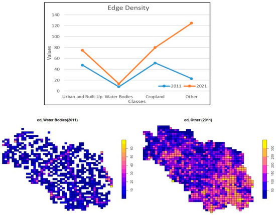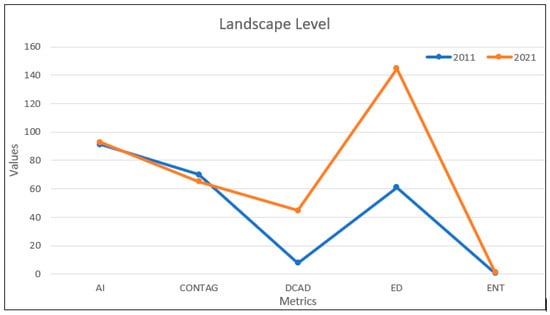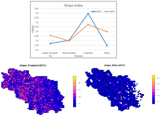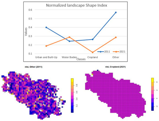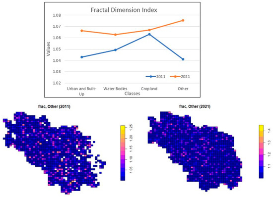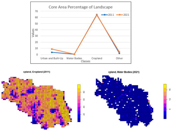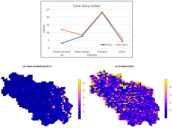 - CAI: The core area index indicates what percentage of a patch is made up of the core region. The CAI values range from 0 to 100, where 0 indicates no core area, and 100 indicates a core area. Here, when values increase from 0 to 100, it indicates increasing values in different variables and vice versa. In the study area during 2011–2021, the values of CAI ranged almost identically in waterbodies (7.69, 8.48), cropland (23.01, 23.48), and other classes (4.31, 6.02). However, in 2021, the urban and built-up class values (11.90) increased, as shown in Figure 7. The urban land patches [50] grew larger. This increase in the CAI for urban and built-up areas reflects the rapid urbanization occurring in the NCR, indicating a significant transformation of the landscape. As urban land patches expand, they encroach upon surrounding areas, potentially leading to habitat fragmentation and altered ecological dynamics. These changes underscore the need for effective urban planning and land management strategies to mitigate negative impacts on the environment. The results align with findings from [51], which reported similar patterns of urban growth and its implications for landscape ecology.