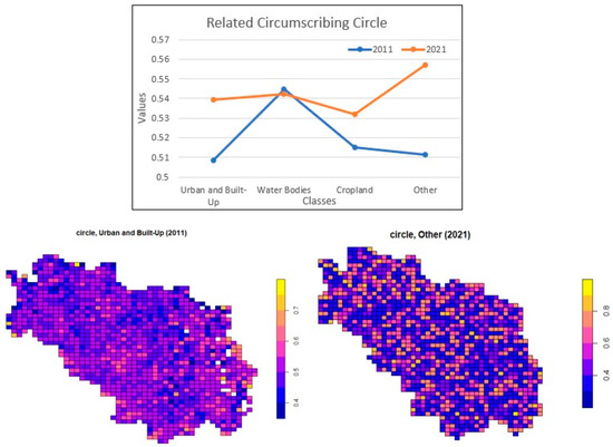 Figure 7. Graphical and pictorial representation of the highest and lowest values of a CAI, patch-level landscape metric. - CIRCLE: A related circumscribing circle metric is the ratio of the patch area to the patch’s smallest circumscribing circle [52]. The diameter of the patch connecting the opposite corner points of the two farthest cells equals the diameter of the smallest circumscribing circle. The value ranges from 0 to 1, where 0 indicates the circular patch, and 1 indicates the linear patch. Here, values increase from 0 to 1. This indicates the changing pattern in given variables, i.e., from circular to linear and vice versa. Figure 8 shows that the urban and built-up class had the lowest value (0.50) in 2011, and the other class showed the highest value (0.55). Fragmentation occurred in 2021 because the values of the classes increased except for waterbodies. The increase in values across most classes by 2021, particularly for cropland and other land uses, signifies a transition from circular to more linear configurations. This shift highlights the fragmentation of the landscape, driven by urban expansion and the encroachment of development on previously contiguous patches. The decrease in waterbodies indicates their relative stability amidst increasing fragmentation elsewhere. Similar studies, such as those by [53], have documented these trends, emphasizing the interconnectedness of urbanization and land use changes in shaping ecological patterns.