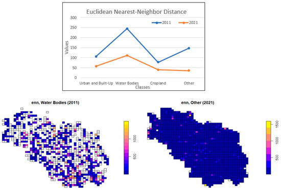 Figure 9. Graphical and pictorial representation of the highest and lowest values of an ENN, patch-level landscape metric. - SHAPE: The shape index value ranges from 1 and increases without limits. When values increase above 1, the patch shape becomes more complex. The values of the study area indicate that all values increase without limit. Since the patch shape of the landscape was more complex in 2011, the values of some classes, such as waterbodies (1.29) and cropland (1.47), decreased in 2021 (Figure 10).