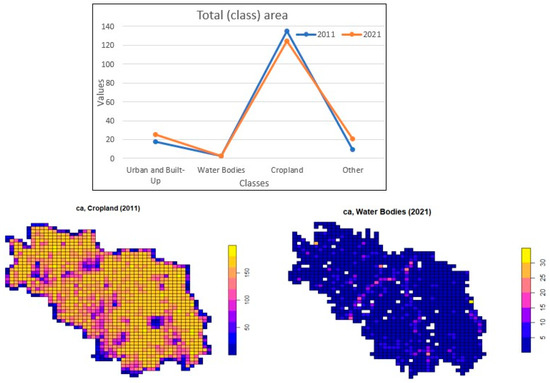 - CA: The total area of all patches in the corresponding land class is the class area. This metric was used to calculate all class patches. Here, the range starts at 0 and increases without limit; 0 indicates the patch area of the class, and when it increases from 0, it indicates the decreasing size of the patch area. However, when it increases without limits, the patch area becomes larger. Figure 12 shows the largest cropland area (135.40) in 2011 and the lesser waterbodies area (2.52) in 2021.