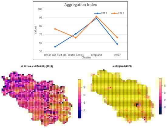 Figure 12. Graphical and pictorial representation of the highest and lowest values of a CA, class-level landscape metric. - Aggregation index (AI): This index measures the district’s aggregation. The higher the value of the AI, the more aggregated it is, and the lower the value, the more disaggregated it is. Here, the range lies between 0 and 100; 0 indicates the maximum disaggregated class, and 100 indicates maximally aggregated classes. Figure 13 depicts the fact that cropland patches were compact or aggregated in nature in both years, but fragmentation occurred in the landscape with lower values, implying urban patch desegregation in 2011. Finally, in 2021, small fragmented areas in waterbodies were observed, and in 2011, small fragmented patches were observed in other classes.