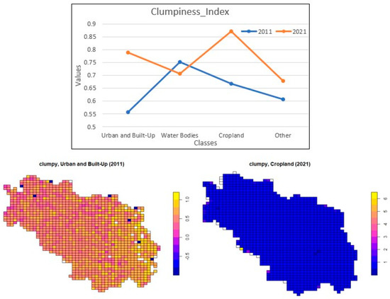 Figure 14. Graphical and pictorial representation of the highest and lowest values of a CLUMPY, class-level landscape metric. - ED: ED is also used to assess the fragmentation and spatial heterogeneity of the landscape. Here, the range starts at 0 and increases without limits; 0 denotes that only one patch is present (and the landscape boundary is not included), and it increases without limits, indicating that the landscape has become patchier. During the study period of 2011–2021, the value of edge density was higher in barren and fallow land (124.87) than in the other classes that compute the level of fragmentation. In 2021, compact or clumped urban growth experienced relatively higher values (74.78) in urban and built-up class areas, as shown in Figure 15.