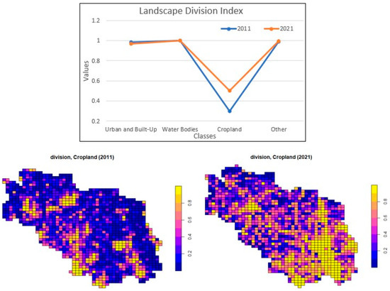 Figure 16. Graphical and pictorial representation of the highest and lowest values of a DIVISION, class-level landscape metric. - CPLAND: CPLAND is the percentage of the class core area in relation to the total landscape area. The value of CPLAND lies between 0 and 100, as 0 indicates all patches, and it increases toward 100, indicating patches that are larger while being rather simple in shape. The PLAND values show a growth trend in the urban and built-up classes over the last decade. The higher percentage growth of built-up area (8.90%) from 2011 to 2021 is shown in Figure 17.