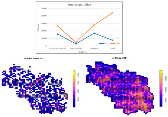 Figure 19. Graphical and pictorial representation of the highest and lowest values of a TE, class-level landscape metric. - PAFRAC: PAFRAC describes the patch complexity of the class. Here, the values lie between 1 and 2, where 1 indicates patches with simple shapes, and 2 indicates patches with irregular shapes. Where values increase from 1 to 2, shapes begin to become irregular. PAFRAC results show that patches of other classes (1.41) are irregular in shape, and cropland (1.26) has simple-shaped patches in 2021, as shown in Figure 20.