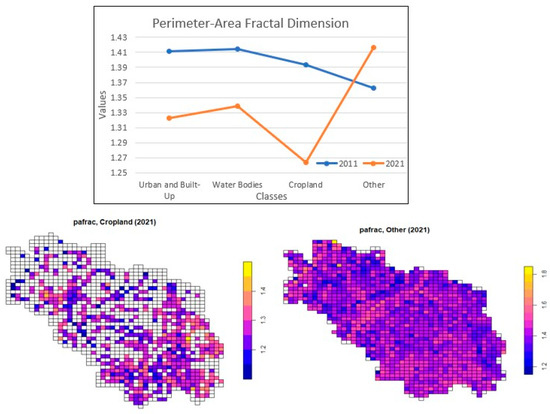 Area and perimeter changes in the class of cropland & urban and Built-up from 2011 to 2021.