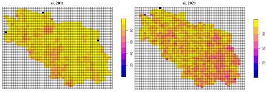 - AI: The landscape’s configuration is measured by AI. The values lie between 0 and 100; 0 indicates maximally disaggregated classes, and 100 indicates maximally aggregated classes. When the value increases from 0 to 100, maximally aggregated classes begin to develop. Figure 21 and Figure 26 depict a fragmented landscape with many edges. AI values for both years are nearly identical.