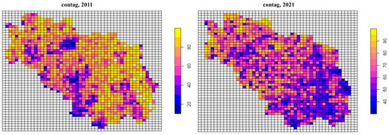 Figure 22. Pictorial representation of a CONTAG, landscape-level landscape metric. - DCAD: DCAD is a core area metric. DCAD values lie below 0, and 0 indicates that no patch contains a disjunct core area. It increases without limit as disjunct core areas become more present, i.e., patches become larger and less complex. Figure 23 and Figure 26 show that patches of the study area become larger because the DCAD values increased in 2021 (44.86), as there are more disjoint core areas in 2021 than in 2011.