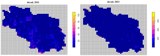 The maximum region of the study area is covered by cropland, which is 83% of the total study area, although between 2011 and 2021, cropland declined from 83% to 72% of the total area. This declining trend is shown in Table 7 and Figure 3a,b.