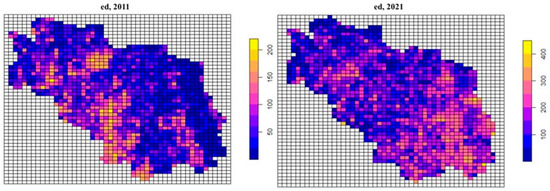 The landscape’s spatial and structural changes, particularly how fragmentation and patch metrics, reflect the ecological shifts within the study area. For example, the increase in edge density and decrease in patch size across cropland areas from 2011 to 2021 indicate a rise in landscape fragmentation. This fragmentation can disrupt habitat connectivity, reduce biodiversity, and create barriers to species movement, ultimately leading to ecological degradation. Furthermore, the metrics highlight a decline in spatial heterogeneity, especially in regions where urban expansion and infrastructure developments are prevalent. This loss of heterogeneity reflects reduced resilience in the landscape, as smaller, more isolated patches provide fewer resources and habitat diversity than larger, contiguous ecosystems. Consequently, our metrics offer insights into how land use changes impact ecological stability, suggesting a trend toward increased vulnerability to environmental pressures within the study area.