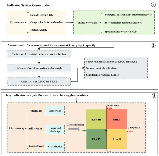The Yangtze River Economic Belt (YREB), spanning 11 provinces and municipalities across China, is of paramount importance due to its high economic development and strategic role in national distribution. However, the YREB, which has experienced rapid economic growth, faces challenges resulting from its previously expansive development model, including regional resource and environmental issues. Consequently, a systematic analysis encompassing socio-economic, ecological, and resource-environmental aspects is vital for a comprehensive and quantitative understanding of the YREB’s overall condition. This study explores resource and environmental carrying capacity (RECC) by constructing an integrated framework that includes remote sensing data, geographic information data and social statistical data, which allows for a precise analysis of RECC dynamics from 2010 to 2020. The findings demonstrate an upward trend in the overall quality of RECC from 2010 to 2020, achieving higher grades over time. However, there is significant spatial heterogeneity, with a notable decrease in RECC levels moving from the eastern to the western regions within the YREB. Moreover, low-level RECC areas situated in the northwest of the YREB, show a trend of moving toward regions of higher altitude from 2010 to 2020 based on analysis using the standard deviation ellipse (SDE) method. When considering to the three major urban agglomerations within the YREB, overall RECC in middle and lower agglomerations is generally stable and on an upward trend while cities in upper reaches exhibit significant variation and fluctuations, highlighting them as areas requiring future focus. Therefore, specific indicators were applied to monitor RECC risk for each of these three agglomerations, respectively, after which optimized strategies could be proposed based on different early warning levels. Ultimately this study allows local authorities to implement timely and effective interventions to mitigate risks and promote sustainable development.