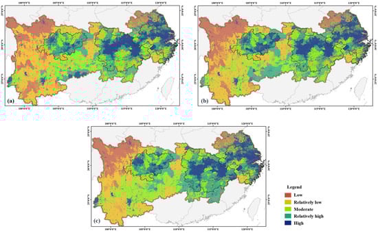 As illustrated in Figure 3, the evaluation outcomes of RECC are classified into five levels using the natural breaks method, also known as the Jenks optimization algorithm, which detects sudden shifts or change points in variables and is specifically intended to determine optimal breakpoints that divide a dataset into homogeneous groups [34]. The classification levels are high, relatively high, moderate, relatively low, and low. These levels correspond to the evaluation results for the years 2010, 2015, and 2020, marked as a, b, and c, respectively. High-level RECC areas, indicating a strong resource supply and environmental capacity, support economic and social development. By contrast, areas with low-level RECC require measures to reduce resource consumption, alleviate environmental pressures, and enhance resource management, offering insights for sustainable development policies. The findings reveal a spatial distribution pattern of RECC levels in the YREB, decreasing from east to west. Notably, the Yangtze River’s middle and lower plains and certain areas of the Sichuan Basin exhibit significantly higher RECC values. This is because these regions are characterized by rapid economic growth, advanced urbanization, and higher per capita GDP, resulting in a superior socio-economic development level. Additionally, the potential for agricultural production and the effectiveness of arable land irrigation are substantial, enhancing the carrying capacity for water and land resources. This trend highlights the need for continued investments in urban infrastructure and resource management to maintain and enhance RECC in these already high-performing areas. Conversely, the RECC in the western Sichuan Plateau, Yunnan—Guizhou Plateau, and southeastern hilly areas is markedly lower. These areas exhibit lower urbanization levels, reduced population density, diminished per capita GDP, and a weaker socio-economic carrying capacity. The disparity in RECC between these regions and the more developed eastern areas may be attributed to the challenges of geographical barriers, limited access to infrastructure, and lower industrialization. Addressing the socio-economic disparities through targeted policy measures such as infrastructural development, investment in education, and support for sustainable agricultural practices could help improve RECC in these less developed regions.