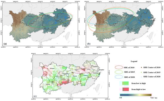 Figure 4 shows the spatio-temporal variations in RECC in the YREB from 2010 to 2020, using the SDE method. Specifically, the high-level RECC area remains consistent between 2010 and 2020, mainly in the flatlands of the middle and lower Yangtze River, which has a consistent SDE from 2010 to 2020, with centers nearly overlapping and a temporary shift northwest from 2010 to 2015 before returning to its original location by 2020. This area is rich in water resources, such as the typical Taihu Lake, Poyang Lake, Chaohu Lake, and other such lakes, indicating high RECC. In Figure 4b, the SDE of the low-level RECC area is mainly situated in the northwest of the YREB. This area is characterized by higher elevations and shows a trend of initially moving northeast before shifting northwest, generally moving toward regions of higher altitude from 2010 to 2020. At the same time, the extent of the SDE within the low-level RECC area is gradually decreasing, indicating a contraction of these regions.