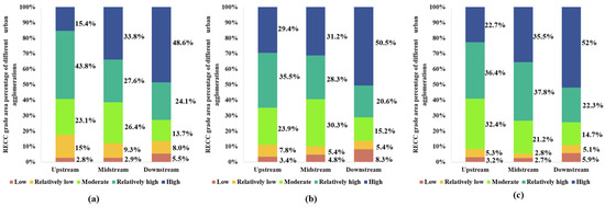 In 2010, high RECC regions were predominantly located in the downstream urban cluster of the Yangtze River, with the proportion of high RECC areas increasing progressively from the river’s upper reaches to its middle and lower reaches by 2015; there was a significant rise in the percentage of high RECC regions in both the upstream and downstream urban clusters along the Yangtze River. Specifically, the upstream urban cluster saw an increase in high RECC areas from 15.4% to 29.4%, and the downstream cluster reached a remarkable 50% high RECC proportion. In 2020, it is notable that the proportion of high-level RECC areas in the upstream cities declined to 22.7% from 29.4% in 2015, with reductions also seen in the low-level and relatively low-level areas. Meanwhile, the middle and upper urban clusters experienced further increases in the proportion of high-level RECC areas.