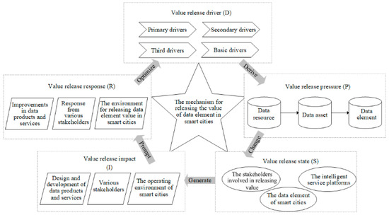 Under the DPSIR framework, the value release process of smart city data elements can be divided into five parts, namely, smart city data element value release driver (D), smart city data element value release pressure (P), smart city data element value release state (S), smart city data element value release impact (I), and smart city data element value release response (R) [29]. The smart city data element value release driver is the deepest reason affecting the value release of data elements in smart cities, driving the whole value release process to happen. The smart city data element value release pressure derived from the smart city data element value release driver can directly act on the smart city data element value release state, prompting the original value release state to change. The change in the state of the value release of data elements in smart cities will lead to the generation of different value release impacts, and different value release impacts of data elements in smart cities will prompt people in smart cities to take different initiatives or actions to respond. These response initiatives and actions will inevitably change the general environment for releasing the value of data elements in smart cities, bring about further optimization and improvement of the smart city data element value release driver, then change the whole process of releasing the value of data elements in smart cities. The value of data elements in smart cities is released in this cyclic and complex process, and the release mechanism is shown in Figure 1.
